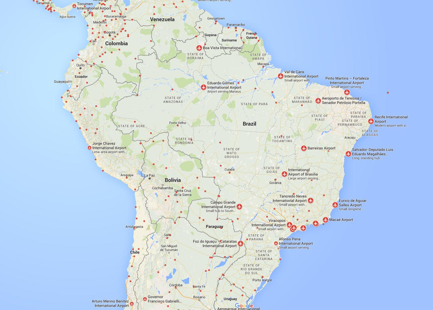 Gli aeroporti internazionali in Brasile mappa. Brasile aeroporti internazionali mappa (America del Sud - america) e per la stampa. Brasile aeroporti internazionali mappa (America del Sud - America) scaricare. Il trasporto aereo è molto sviluppato. Nel 2001, le compagnie aeree locali e internazionali hanno trasportato 34.285.600 passeggeri. Nel 2001 c'erano circa 3.365 aeroporti, di cui 665 con piste asfaltate. Dei 48 aeroporti principali, 21 sono internazionali; di questi, l'aeroporto internazionale di Rio de Janeiro Galeao e l'aeroporto internazionale di San Paolo Guarulhos sono di gran lunga i più attivi come mostrato nella mappa degli aeroporti internazionali del Brasile. La principale compagnia aerea internazionale è Empresa de Viaçao Aérea Rio Grandense (VARIG). Altre compagnie aeree brasiliane sono Transbrasil Linhas Aéreas, Cruzeiro do Sul, (associata a VARIG dal 1983), e Viaçao Aérea Sao Paulo (VASP), che gestisce solo il traffico interno ed è gestito dallo stato di San Paolo. Tutti tranne VASP sono di proprietà privata.